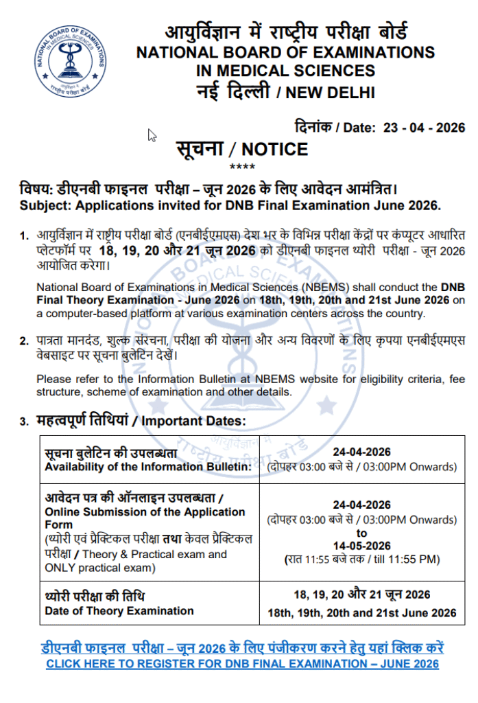 Attention DNB Trainees! The National Board of Examinations in Medical Sciences (NBEMS) has officially released the schedule for the DNB Final Theory Examination β June 2026.